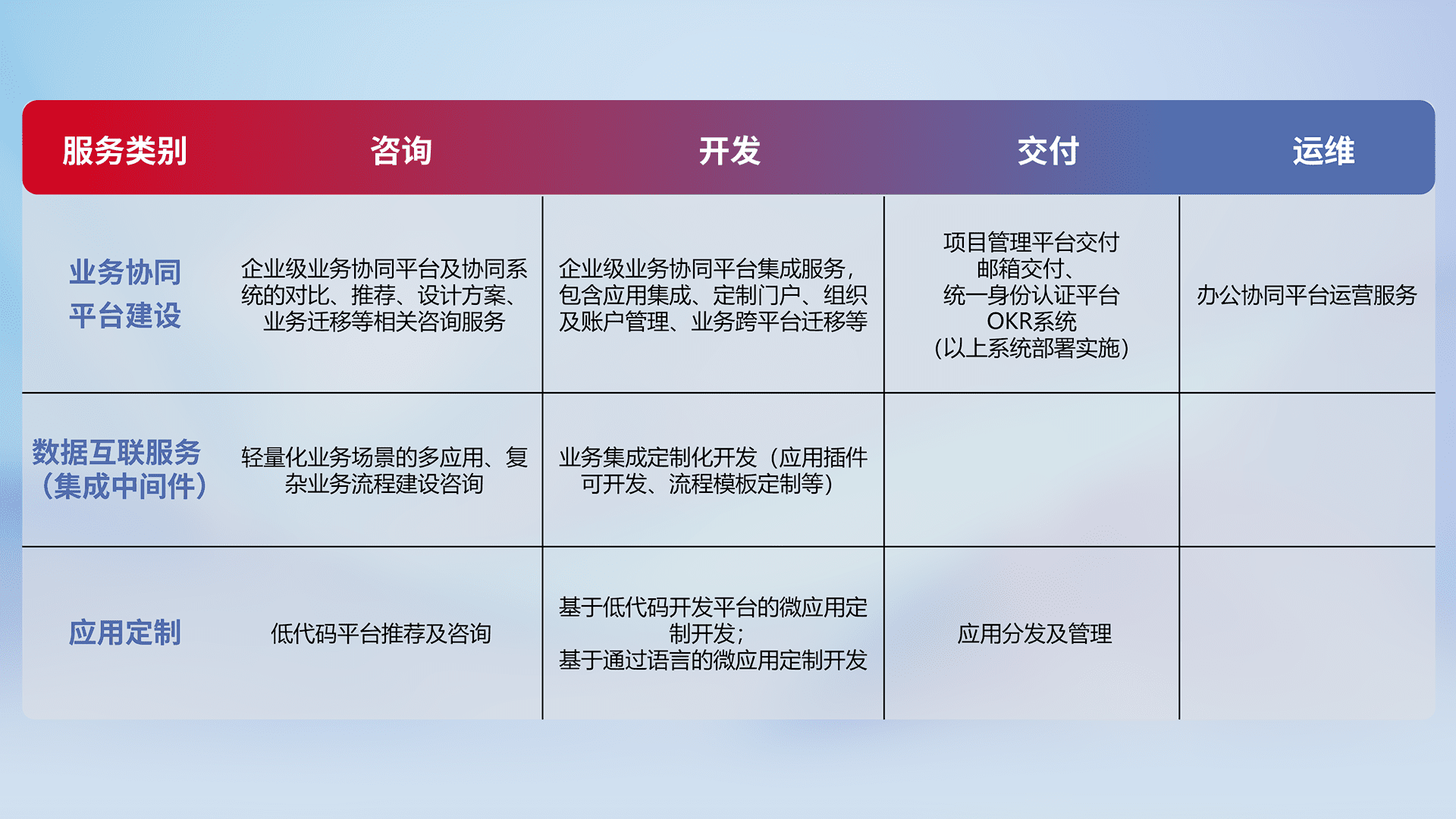 针对钉钉、、、企微、、、IDaas等平台级产品提供产品的规划、、、方案、、、、交付、、、、定制化开发等服务,,实现如统一协同办公、、、、智能客户服务、、、、混合会议管理、、、、智能数据查询、、等业务场景,,实现数字化转型。。